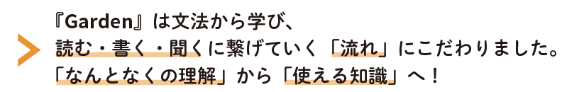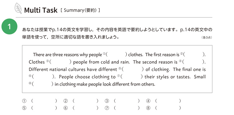 Scanning:ポスターや英文から必要情報を素早く読み取る力Summary:文章の要点を的確にまとめる力Writinig:文法を生かして表現する作文力
