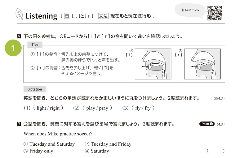 Aではディクテーション(書き取り)BではUnit内で学習した文法を含んだリスニング問題