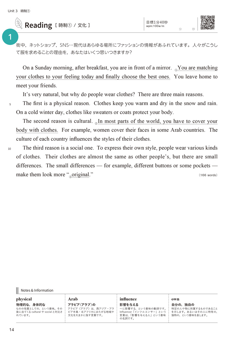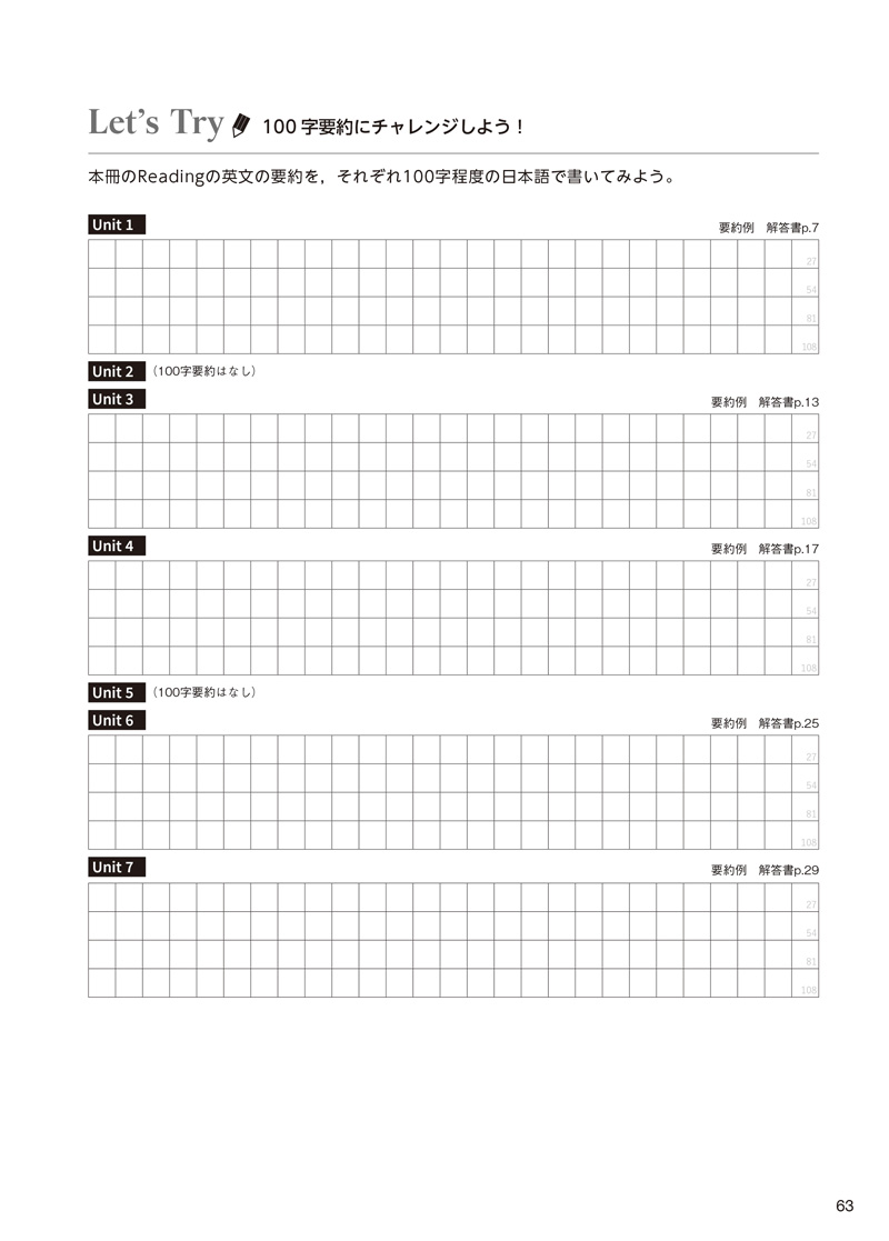 提出用ノートには、各UnitのReadingを100字要約するコーナーがあります。解答例は解答・解説書に収録しています。